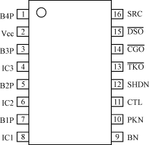 圖1引腳排列 6)靜態(tài)電流和關(guān)斷狀態(tài)電流特別小靜態(tài)工作電流典型值為30μA,連續(xù)功耗667mW,關(guān)斷狀態(tài)下輸入電流0.8μA,可防止電池組長(zhǎng)期存放時(shí),因自放電電流過(guò)大而損壞。 7)最高輸入電壓28V滿足3串和4串鋰電池組的要求。 8)采用小型16腳QSOP封裝印刷電路板面積很小,保護(hù)板可方便地裝入電池組中。 9)工作溫度范圍寬工作溫度范圍-40℃~ +85℃,存貯溫度范圍-65℃~+150℃。 3引腳排列及功能 MAX1894/MAX1924引腳排列如圖1所示。各引腳功能如下: 腳1(B4P)接第4只單體電池的正極,采用MAX1924V保護(hù)3串鋰電池組時(shí),應(yīng)將B4P與B3P腳短路; 腳2(Vcc)電源輸入腳,通過(guò)二極管和電容器接電池組的正極; 腳3(B3P)接第3只單體電池的正極; 腳4(IC3)內(nèi)部接點(diǎn),應(yīng)用時(shí)懸空; 腳5(B2P)接第2只單體電池的正極; 腳6(IC2)內(nèi)部接點(diǎn),應(yīng)用時(shí)懸空; 腳7(B1P)接第1只單體電池的正極; 腳8(IC1)內(nèi)部接點(diǎn),應(yīng)用時(shí)懸空; 腳9(BN)接第1只單體電池負(fù)極和電流取樣電阻Rsense的上端,也是芯片的接地腳; 腳10(PKN)接電池組負(fù)極,電流取樣電阻Rsense接在BN和PKN之間; 腳11(CTL)外部控制信號(hào)輸入腳,如不需要外部控制電路或微控制器,接PKN腳; 腳12(SHDN)關(guān)斷腳,加低電平時(shí)保護(hù)器正常工作,加高電平時(shí)若電池組未接入充電器,保護(hù)電路進(jìn)入關(guān)斷狀態(tài),如不需要外部控制電路或微控制器,接PKN腳; 腳13(TKO)涓流充電驅(qū)動(dòng)器輸出腳,接外部涓流充電控制P溝道MOSFET的柵極; 腳14(CGO)快速充電驅(qū)動(dòng)器輸出腳,接外部快速充電控制MOSFET的柵極; 腳15(DSO)放電驅(qū)動(dòng)器輸出腳,接外部放電控制P溝道MOSFET的柵極; 腳16(SRC)外接MOSFET的共源極接點(diǎn),提供DSO、TKO和CGO驅(qū)動(dòng)器所需的柵極偏壓。 4基本工作原理 MAX1894/MAX1924內(nèi)部框圖如圖2所示,由單體電池電壓取樣電路、比較電路、?放電電流檢測(cè)比較電路、故障邏輯電路和快速充電、涓流充放電控制MOSFET的驅(qū)動(dòng)電路等部分組成。 單體電池電壓選擇器可以交替檢測(cè)四只單體電池的電壓,該電壓與過(guò)壓、欠壓門限值經(jīng)比較器比較后,誤差信號(hào)經(jīng)狀態(tài)機(jī)送入故障邏輯電路。如果各單體電池的電壓均在過(guò)壓值以下,欠壓門限值以上,驅(qū)動(dòng)器可輸出驅(qū)動(dòng)信號(hào),使快速充放電控制MOSFET導(dǎo)通,電池組正常充放電。如果任意一個(gè)單體電池的電壓高于過(guò)充電門限值,驅(qū)動(dòng)器輸出信號(hào)使快速充電控制MOSFET關(guān)斷,電池組停止工作。如果任意一個(gè)單體電池的電壓低于過(guò)放電保護(hù)門限值,驅(qū)動(dòng)信號(hào)使放電控制MOSFET關(guān)斷,電池組停止放電。 電流取樣電阻Rsense兩端電壓通過(guò)腳PKN和BN加到內(nèi)部比較器的輸入端,比較器輸出電壓經(jīng)置位/復(fù)位定時(shí)器后,也加到故障邏輯電路,故障邏輯電路通過(guò)驅(qū)動(dòng)器控制外接的MOSFET。當(dāng)充電電流過(guò)大時(shí),充電控制MOSFET關(guān)斷,當(dāng)放電電流過(guò)大時(shí),放電控制MOSFET關(guān)斷,因而可防止電池組因充放電電流過(guò)大而損壞。