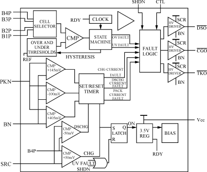 鋰離子電池保護(hù)器 這里以MAX1894/MAX1924為例說(shuō)明其功能及特點(diǎn)。MAX1894設(shè)計(jì)用于4節(jié)鋰離子電池組,而MAX1924適用于3節(jié)或4節(jié)的電池組。兩個(gè)保護(hù)器可監(jiān)控串聯(lián)電池中每一個(gè)電池的電壓