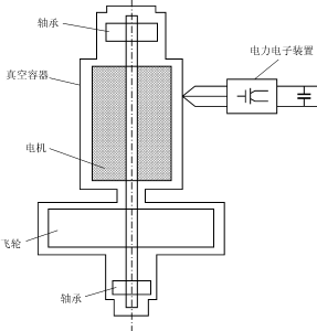 圖1?? 飛 輪 儲 能 裝 置 原 理 圖 ??? 事實上,為了減少空閑運轉(zhuǎn)時的損耗,提高飛輪的轉(zhuǎn)速和飛輪儲能裝置的效率,飛輪儲能裝置軸承的設(shè)計一般都使用非接觸式的磁懸浮軸承技術(shù),而且將電機和飛輪都密封在一個真空容器內(nèi)?減少風(fēng)阻。通常發(fā)電機和電動機使用一臺電機來實現(xiàn),通過軸承直接和飛輪連接在一起。這樣,在實際常用的飛輪儲能裝置中,主要包括以下部件:飛輪、軸、軸承、電機、真空容器和電力電子裝置,飛輪儲能裝置結(jié)構(gòu)的示意圖如圖2所示。