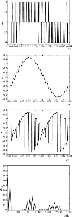 a= 由正弦定理得=所以sinα= α=arcsin() (31) 故:-cos(2ωt+θ+)-cos(2ωt+2θ-)=-a·cos(2ωt+α+θ+)(32) 將式(32)代入式(29)得:Iin.r=A1·Icosθ-a·cos(2ωt+α+θ+)(33) 由式(12)得:Iin.f2=cos(2ωt+2?+)(34) 故:Ii=Iin.r+I(xiàn)in.f2=A1·I·cosθ-a·cos(2ωt+α+θ+)+cos(2ωt+2?+)(35) 由式(35)得到消除Iin.r中二次諧波分量的條件為a=;B1=(36)α+θ+=2?+;2?=α+θ-(37) 當(dāng)滿足式(36)和(37)條件時(shí)就能消去式(29)中的二次諧波分量,使Ii=A1·I·cosθ。 對(duì)于三相四線逆變器,必須采用兩個(gè)有源濾波器,即有源濾波器1和2,聯(lián)合使用這兩個(gè)濾波器,就可以消除直流環(huán)中由于不平衡負(fù)載引起的低頻脈動(dòng)電流及無功伏安。同時(shí),中性線中的電流INr也被消除,由此,直流環(huán)電容上就沒有基頻零序電流流過。前面已經(jīng)說過,非線性負(fù)載與不平衡負(fù)載對(duì)直流環(huán)節(jié)輸入電流的影響相同,故用上述方法同樣也補(bǔ)償了非線性負(fù)載的影響。詳細(xì)說明請(qǐng)參閱有關(guān)文獻(xiàn)。 三相四線逆變器中半橋有源濾波器1和全橋有源濾波器2的控制電路如圖9所示。圖9(a)是半橋?yàn)V波器1的控制電路,圖9(b)是全橋?yàn)V波器2的控制電路。與圖3相同,圖9所示控制電路也是采用兩態(tài)滯后電流跟蹤控制。圖9(a)使INr跟蹤Iref.1≡0,以消除中性線電流;圖9(b)使Ii中的二次諧波分量跟蹤Iref.2≡0,以消除Ii中的二次諧波分量。 3?2仿真結(jié)果 對(duì)采用半橋有源濾波器1,全橋有源濾波器2及無源濾波器LoCo綜合進(jìn)行濾波補(bǔ)償?shù)娜嗨木€逆變器進(jìn)行仿真,得到圖10-圖18的結(jié)果。圖10表示的是三相四線逆變器的電壓和電流波形,其中圖10(a)是輸出電壓uaN的波形;圖10(b)是線電流ia的波形;圖10(c)是線電流ib的波形。圖11表示的是“C相斷開”的中性線電流iN=ia+ib的電流波形及iN的頻譜。圖12表示的是輸入電流iin的波形及其頻譜。圖13表示的是有源濾波器1的波形,其中圖13(a)是電壓uRN的波形,圖13(b)是電流iNf的波形。圖14表示的是合成中性線電流iNr=iNf+iN的波形圖及其頻譜。圖15表示的是直流環(huán)節(jié)向有源濾波器1提供的電流iin.f1的波形圖及其頻譜。圖16表示的是直流環(huán)節(jié)電流iin.r=iin+iin.f1的波形及其頻譜。圖17表示的是直流環(huán)節(jié)向有源濾波器2提供的電流iin.f2的波形。圖18表示的是合成輸入電流ii的波形與頻譜。 4結(jié)論 當(dāng)三相逆變器帶不平衡或非線性負(fù)載時(shí),會(huì)使直流輸出電流出現(xiàn)2倍于逆變器工作頻率的脈動(dòng)分量,