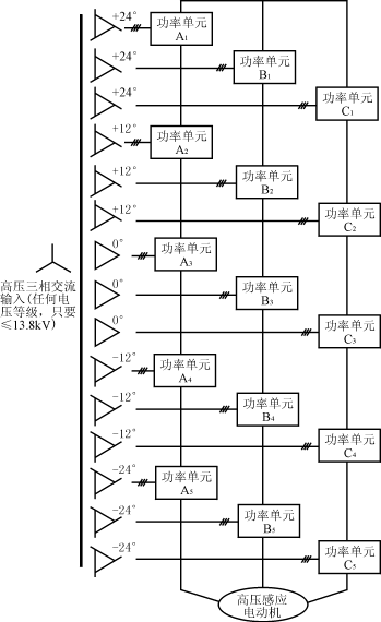 ??? 圖12中的每個(gè)功率單元都是由低壓絕緣柵雙極型晶體管(IGBT)構(gòu)成的三相輸入,單相輸出的低壓PWM電壓型逆變器。功率單元電路見(jiàn)圖14。每個(gè)功率單元輸出電壓為1、0、-1三種狀態(tài)電平,每相5個(gè)單元疊加,就可產(chǎn)生11種不同的電平等級(jí),分別為±5、±4、±3、±2、±1和0。圖15為一相合成的正波輸出電壓波形。用這種多重化技術(shù)構(gòu)成的高壓變頻器,也稱為單元串聯(lián)多電平PWM電壓型變頻器。采用功率單元串聯(lián),而不是用傳統(tǒng)的器件串聯(lián)來(lái)實(shí)現(xiàn)高壓輸出,所以不存在器件均壓的問(wèn)題。每個(gè)功率單元承受全部的輸出電流,但僅承受1/5的輸出相電壓和1/15的輸出功率。變頻器由于采用多重化PWM技術(shù),由5對(duì)依次相移12°的三角載波對(duì)基波電壓進(jìn)行調(diào)制。對(duì)A相基波調(diào)制所得的5個(gè)信號(hào),分別控制5個(gè)功率單元A1~A5,經(jīng)疊加可得圖15所示的具有11級(jí)階梯電平的相電壓波形,它相當(dāng)于30脈波變頻,理論上19次以下的諧波都可以抵消,總的電壓和電流失真率可分別低于1.2%和0.8%,堪稱完美無(wú)諧波(Harmony)變頻器。它的輸入功率因數(shù)可達(dá)0.95以上,不必設(shè)置輸入濾波器和功率因數(shù)補(bǔ)償裝置。變頻器同一相的功率單元輸出相同的基波電壓,串聯(lián)各單元之間的載波錯(cuò)開(kāi)一定的相位,每個(gè)功率單元的IGBT開(kāi)關(guān)頻率若為600Hz,則當(dāng)5個(gè)功率單元串聯(lián)時(shí),等效的輸出相電壓開(kāi)關(guān)頻率為6kHz。功率單元采用低的開(kāi)關(guān)頻率可以降低開(kāi)關(guān)損耗,而高的等效輸出開(kāi)關(guān)頻率和多電平可以大大改善輸出波形。波形的改善除減小輸出諧波外,還可以降低噪聲、du/dt值和電機(jī)的轉(zhuǎn)矩脈動(dòng)。所以這種變頻器對(duì)電機(jī)無(wú)特殊要求,可用于普通的籠型電機(jī),且不必降額使用,對(duì)輸出電纜長(zhǎng)度也無(wú)特殊限制。由于功率單元有足夠的濾波電容,變頻器可承受-30%電源電壓下降和5個(gè)周期的電源喪失。這種主電路拓?fù)浣Y(jié)構(gòu)雖然使器件數(shù)量增加,但由于IGBT驅(qū)動(dòng)功率很低,且不必采用均壓電路、吸收電路和輸出濾波器,可使變頻器的效率高達(dá)96%以上。 圖14? 功率單元電路