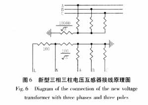 4163 三相三柱電壓互感器的妙用 最近,由江西互感器廠生產(chǎn)的由三相三柱式電壓互感器與單相式零序電壓互感器組合,如圖5所示,構(gòu)成了具有消諧功能的電壓互感器組