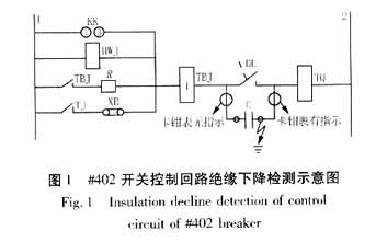 2000年6月5日紀(jì)村站110kV#402開(kāi)關(guān)控制回路絕緣下降檢測(cè)示意圖如圖1所示,開(kāi)關(guān)處于分閘狀態(tài),用卡鉗表實(shí)現(xiàn)了對(duì)接地故障點(diǎn)的精確定位,發(fā)現(xiàn)電容C的一端引出頭絕緣破損,更換C后正常??梢?jiàn)裝置對(duì)故障點(diǎn)查找比較方便快捷。