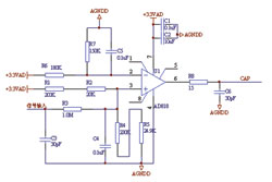 信號預處理模塊主要包括四階低通濾波電路和同步方波變換電路。根據國家對諧波測量儀器的要求,A級儀器頻率測量范圍是0~2500Hz,故每周波每路采樣128點。根據工程經驗,采用截止頻率為1500Hz的四階巴特沃斯低通濾波器,完全可以達到較好的濾波效果。同時為了提高測量精度,采用了自適應調整采樣間隔技術,即根據捕獲單元測量的頻率自動調整。本系統(tǒng)采用同步方波變換電路部分實現(xiàn)頻率的測量,同時為提高共模抑制比,同步方波變換電路采用開環(huán)方式實現(xiàn)電壓比較并將其輸入到同相端,同時在反相端輸入? +1.5V的比較電平,這樣在輸出端即引腳6處可得到占空比為50%的方波,其中電容C5起抑制高頻噪聲的作用。同步方波變換電路圖如圖3所示。