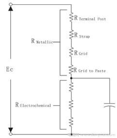 文中使用的方法為內(nèi)阻偵測法,電池的內(nèi)阻包含了兩種意思,其中一種指純歐姆電阻,另一種是由電化學(xué)反應(yīng)中電極極化所產(chǎn)生的,如圖7所示。電池內(nèi)阻可分為金屬類電阻(RMetallic)與化學(xué)材料類電阻(RElectrochemical);而在金屬類中又可分極板(RTerminal Post)、金屬帶(RStrap)、極板網(wǎng)柵(RGrid)、極板網(wǎng)柵到糊狀材料(RGrid to Paste);而化學(xué)材料類包含了糊狀材料(RPaste)、電解液(RElectrolyte)、隔離板(RSeparator)。電池的電解液濃度的變化將會影響電池內(nèi)阻值的變化,當(dāng)在充電時內(nèi)阻將會隨電量而降低,但在放電狀態(tài)時,內(nèi)阻將會跟隨電量而有所增加[4-6]。