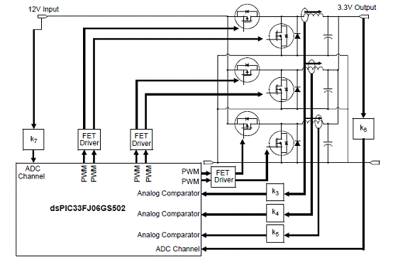 圖7。dsPIC33FJ 多相同步降壓轉(zhuǎn)換器框圖