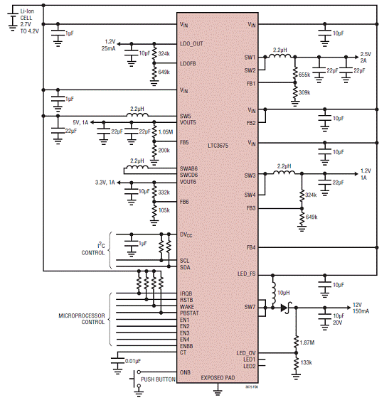 LTC3675采用耐熱增強(qiáng)型 4mmx 7mmx 0.75mm44 引線 QFN 封裝,具7個(gè)獨(dú)立軌、I2C 控制、靈活的排序和故障監(jiān)視。