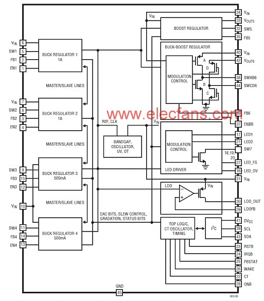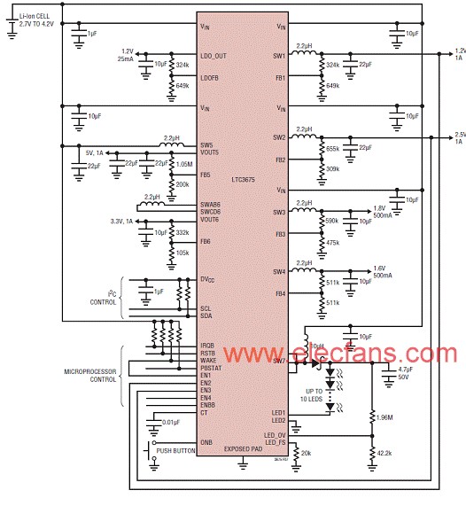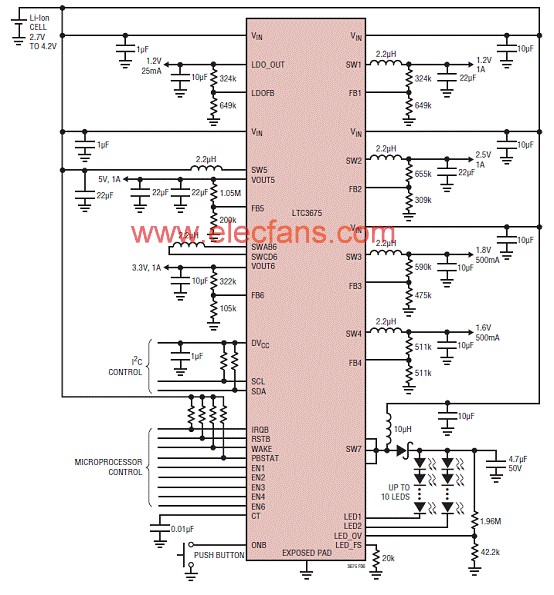 5746 LTC3675 含有 4 個(gè)高效率同步降壓型穩(wěn)壓器、一個(gè)大電流 / 高效率降壓-升壓型穩(wěn)壓器、一個(gè)同步升壓型穩(wěn)壓器、一個(gè)用于驅(qū)動(dòng)兩串 40V-LED 的驅(qū)動(dòng)器和一個(gè)始終保持接通的 LDO。按鈕 ON / O