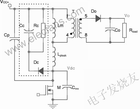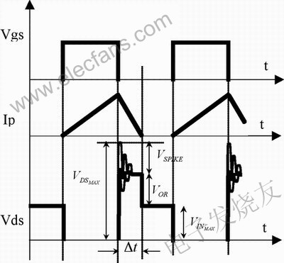 的電流。這就是說(shuō)關(guān)斷以后輸出二極管D2中并未立即出現(xiàn)電流,同時(shí)總變壓器電流在D1中流動(dòng)。漏極電感的電壓是鉗位電壓和重位電壓之間的差,且往往會(huì)快速釋放漏電。如圖所示,經(jīng)過(guò)簡(jiǎn)單計(jì)算便可得到分流至緩沖器的能量