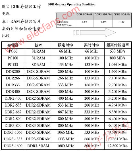 表1顯示了RAM存儲器芯片集在時鐘和轉(zhuǎn)換速率方面的簡要對比,這些芯片集主要用于當今的PC電腦,其中包括SDR、DDR1、DDR2和最新推出的DDR3模塊。