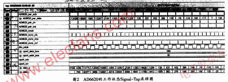 配置成功后的AD6620工作情況如圖2所示,從圖2中可以看到AD6620的輸入數(shù)據(jù)和AD6620的I,Q兩路的數(shù)據(jù)輸出,同時也可以觀察到各級同步信號的脈沖波形。