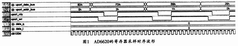 在寫寄存器的過程中,讀信號要保持高(失效)。RDY信號是AD6620給出的握手信號,它會在寫信號WR有效之后變低,之后,根據(jù)目標(biāo)寄存器的不同,將在寫信號有效后最早3個周期內(nèi)再次升高,以表明寫入工作完成。