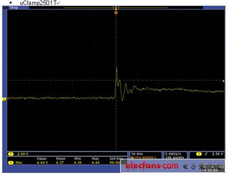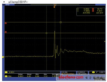 當(dāng)正的靜電發(fā)生時(shí), D2 工作但D1不工作,因此這個(gè)鉗位電壓(clamping voltage)是5V加上D2的正向電壓