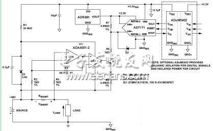 U1B的反饋環(huán)路中有一個(gè)具有大VDS擊穿電壓(70 V)的N溝道MOSFET晶體管,它將U1A的輸出電壓施加于電阻R5兩端,所產(chǎn)生的電流流經(jīng)R6和R7。來自U1A的2.485 V滿量程電壓產(chǎn)生0.498 mA的滿量程電流,它在電阻R7兩端產(chǎn)生2.485 V的滿量程電壓。R7兩端的電壓施加于ADC的AIN?。當(dāng)MOSFET短路時(shí),電阻R6和肖特基二極管D2為AD7171提供輸入保護(hù)。