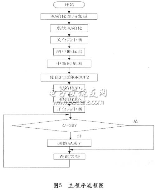 C語言模塊化編寫,其流程如圖4所示,圖4a主程序完成系統(tǒng)初始化,中斷使能,等待中斷等工作;圖4b中斷服務(wù)程序主要完成輸出電壓的數(shù)字量計算和數(shù)據(jù)發(fā)送等工作。在編寫程序過程中,要注意TMS320F2812