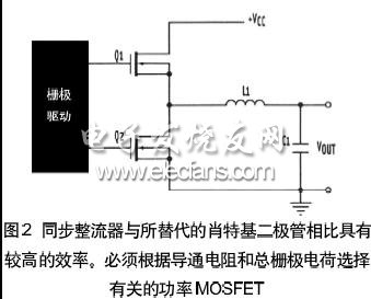 影響效率的另一因素是輸出整流器配置。一些電壓穩(wěn)壓器IC采用外部肖特基整流器。應(yīng)由快速開關(guān)功率MOSFET構(gòu)成的同步整流器(圖2)替代肖特整流器,這可改善效率。