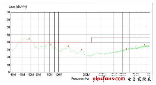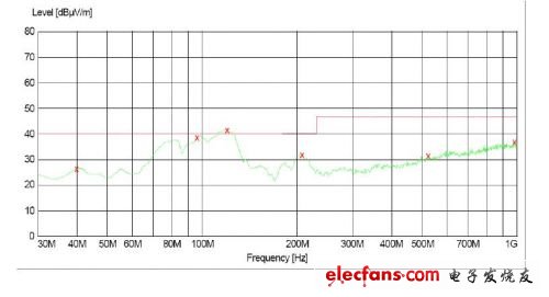 到此,再在傳導(dǎo)方面動(dòng)腦筋已沒什么效果,況且空間有限,也不能加太多或太大的元件。這時(shí)輻射還超標(biāo)很多,如果輻射合格了,傳導(dǎo)也會(huì)有所改進(jìn)。所以,我又轉(zhuǎn)而改進(jìn)輻射問題。先將變壓器加上外屏蔽,同時(shí)在輸出端加一個(gè)200UH的磁環(huán)共模電感,再測(cè)試看到,輻射已改進(jìn)了很多。