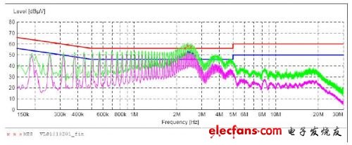 濾波電路此濾波電路在其他電路上由于布局布線呈“一”字排列,傳導(dǎo)騷擾和輻射騷擾能夠滿足標(biāo)準(zhǔn)要求,當(dāng)根據(jù)圖3進(jìn)行布局布線的時(shí)候,測(cè)試結(jié)果在高頻超標(biāo),如下圖4所示:圖4 整改前超標(biāo)數(shù)據(jù)使用寬頻濾波電感,濾波