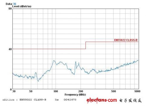 到此,再在傳導(dǎo)方面動腦筋已沒什么效果,況且空間有限,也不能加太多或太大的元件。這時輻射還超標(biāo)很多,如果輻射合格了,傳導(dǎo)也會有所改進。所以,我又轉(zhuǎn)而改進輻射問題。先將變壓器加上外屏蔽,同時在輸出端加一個200UH的磁環(huán)共模電感,再測試看到,輻射已改進了很多。