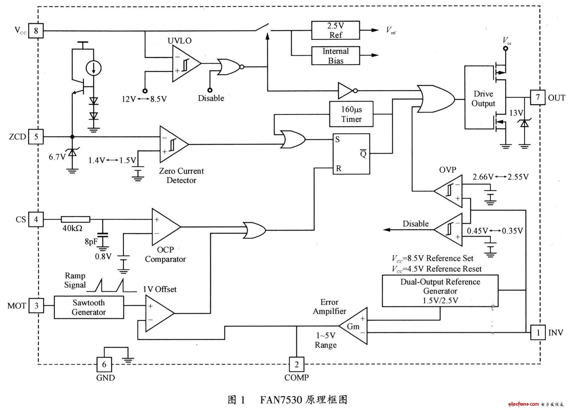 FAN7930C的典型應(yīng)用臨界導(dǎo)通模式控制器。 FA N7930C是一款有源功率因數(shù)校正(PFC)控制器,用于在臨界導(dǎo)通模式(CRM)下工作的升壓PFC應(yīng)用。它使用電壓模式PWM,將內(nèi)部斜坡信號與誤差放大器輸出進行比較,以產(chǎn)生MOSFET關(guān)斷信號