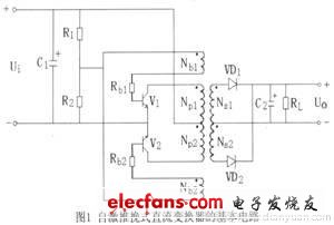 現(xiàn)有的自激推挽式變換器由輸入濾波電路、雙極性推挽式電路和耦合變壓器組成,由于輸入端的電壓通過(guò)電阻R、電容C′直接加在兩個(gè)晶體管上。當(dāng)電壓較低時(shí),晶體管能正常運(yùn)行;而當(dāng)輸入電壓較高時(shí),因?yàn)榕c電阻R并聯(lián)