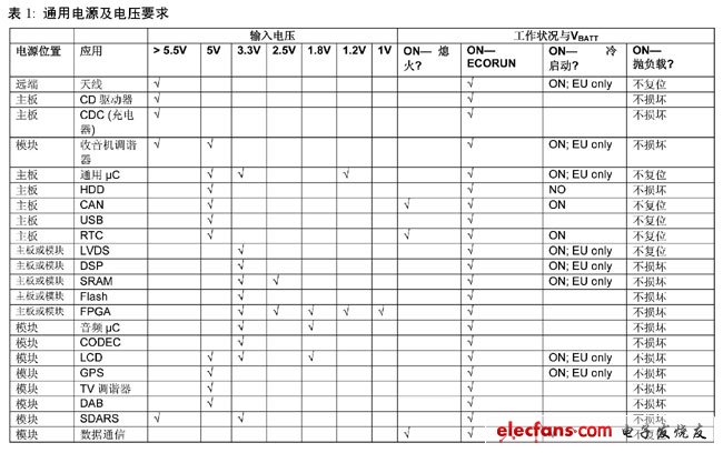 大多數(shù)系統(tǒng)電源的基本架構(gòu)選擇應(yīng)從電源要求以及汽車廠商定義的電池電壓瞬變波形入手。對于電流的要求應(yīng)該反映到電路板的散熱設(shè)計。表1歸納了大多數(shù)設(shè)計的電路及電壓要求。