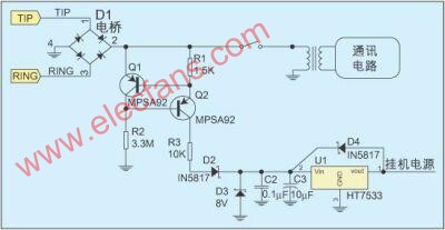 本文對(duì)從電話線上獲取較大功率電源的幾種電路進(jìn)行了分析,比較它們的優(yōu)缺點(diǎn),并給出各個(gè)電路的適用場(chǎng)合。 在IC卡電話、多功能電話以及其它一些利用電話線進(jìn)行通信的小型設(shè)備中使用電話線饋電電路,可以省去額外