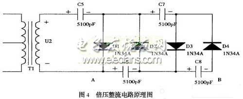 倍壓整流電路適用于輸出直流高電壓、小電流的小功率整流。倍壓整流有半波倍壓整流和全波倍壓整流。根椐本電路的設(shè)計(jì)要求,采用了圖4所示的電路。