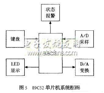 圖5為89C52單片機(jī)系統(tǒng)框圖,單片機(jī)通過APD采樣直流高壓輸出電壓值,CPU對(duì)此值與預(yù)值電壓比較,調(diào)整相應(yīng)DPA轉(zhuǎn)換,使實(shí)際輸出電壓與預(yù)值電壓相同。