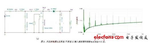 只要加入L2及C2,波形便會(huì)變成正弦曲線,而能量會(huì)重新調(diào)整為相當(dāng)?shù)偷母哳l率峰值。不過(guò),如果不能正確設(shè)計(jì)輸入濾波器,則會(huì)將噪聲放大而使得控制回路不穩(wěn)定。因此,了解濾波器設(shè)計(jì)的概念,對(duì)于優(yōu)化濾波器回波及成本相當(dāng)重要。使用SPICE的AC分析是有效了解濾波器行為的工具。
