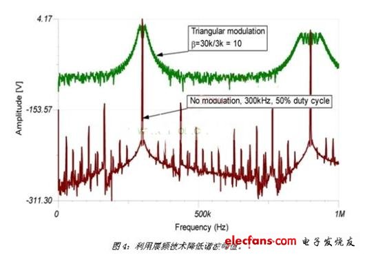 最后,本文將探討另一項(xiàng)越來(lái)越受到廣泛使用的技術(shù),能夠?qū)⒎逯抵C波能量散布于較大的頻帶,以有效降低該能量。該技術(shù)被稱為展頻頻率抖動(dòng)(SSFD),能夠通過(guò)諧波峰值的降低將噪聲信號(hào)從窄頻變成寬頻,以改變?cè)肼曨l譜。其中必須了解能量頻譜的變化,而整個(gè)能量則維持不變。最終的結(jié)果是噪聲水平一般會(huì)增加,從而損害高保真系統(tǒng)。圖4顯示發(fā)生的諧波擴(kuò)散及峰值降低。一般降低的幅度為5至10dB,后續(xù)的諧波會(huì)增加峰值降低的幅度。