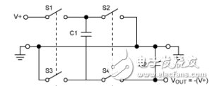 當(dāng)開關(guān) S1 和 S3 接通或斷開時,開關(guān) S2 和 S4 斷開或接通,輸入電源給 C1 充電。在下一個周期中,S1 和 S3 斷開,S2 和 S4 接通,電荷傳送到 C2,產(chǎn)生 VOUT = -(V+)。