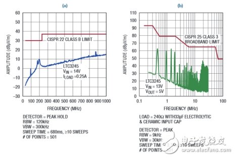圖 4:LTC3245 的輻射 (a) 和傳導(dǎo) (b) EMI