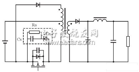 LC吸收電路如圖3所示, 它由Ls、Cs、VDs1和VDs2構成。若開關斷開, 蓄積在漏磁或勵磁等電感中的能量可通過VDs1經電容Cs放電, 使吸收電容Cs電壓反向, 從而使變壓器由電容電壓消磁。這期間, 輸入電壓與吸收電容的電壓加到開關上的電壓極性再次反向。一般情況下, LC吸收電路不消耗能量。