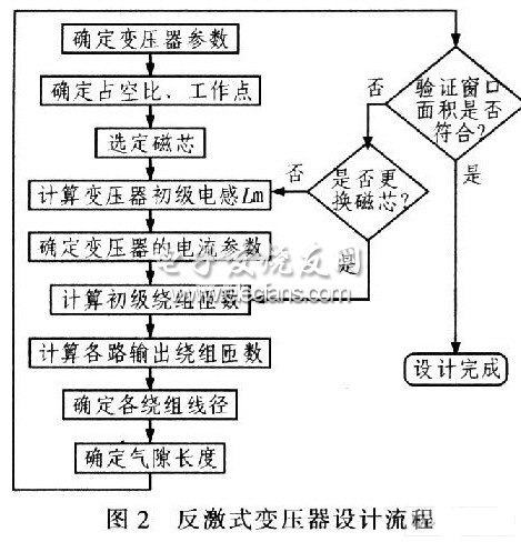單端反激式變壓器設(shè)計流程如圖2所示,首先根據(jù)逆變升壓模塊前后電路的需要,列出輸入電壓、輸出電壓參數(shù)、開關(guān)頻率、額定輸出功率等整個系統(tǒng)需要變壓器完成的參數(shù)要求,包括Uin(min)、Dmax、F、Po(max)分別為輸入直流電壓最小值10 V、最大占空比、開關(guān)頻率10kH-z、輸出最大功率15W等參數(shù),然后再按照下面步驟設(shè)計合適的開關(guān)變壓器。