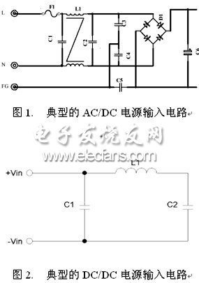 開關(guān)電源的輸入一般有濾波器來減小電源反饋到輸入的紋波,輸入濾波器一般有電容和電感組成∏形濾波器,圖1. 和圖2. 分別為典型的AC/DC電源輸入電路和DC/DC電源輸入電路