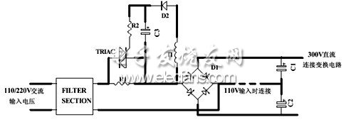 在圖6中,選擇R1作為啟動電阻,在啟動后用可控硅將R1旁路,因在這種沖擊電流限制電路中的電阻R1可以選得很大,通常不需要改變110V輸入倍壓和220V輸入時的電阻值。在圖6中所畫為雙向可控硅,也可以用晶閘管或繼電器將其替代。