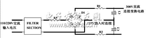 圖5所示為沖擊電流限制電阻的通常位置,對于110V、220V雙電壓輸入電路,應(yīng)該在R1和R2位置放兩個電阻,這樣在110V輸入連接線連接時和220V輸入連接線斷開時的沖擊電流一樣大。對于單輸入電壓電路,應(yīng)該在R3位置放電阻。