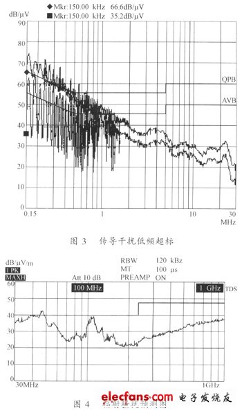 輻射騷擾預測結果在30~50MHz和100MHz處超出限值,如圖4所示。