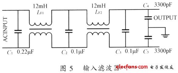 如圖5所示,輸人濾波器是由電感(LFI、LF2)和CY電容(C4、C5)及Cx電容(C1、C2、C3)組成的低通濾波器電路構(gòu)成。對頻率較高的噪聲信號有較大的衰減。C1、C2、C3是濾除共模干擾的電容,C4、C5是濾除差模干擾的電容,LF1、LF2是共模線圈。