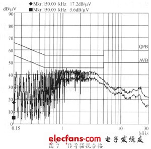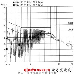 圖3中低頻傳導(dǎo)干擾(O.15~lMHz范圍)超標(biāo),共模噪聲的主要騷擾源是功率開關(guān)管,低頻傳導(dǎo)干擾抑制以增加共模電感的電感量為主,當(dāng)共模電感從原設(shè)計的15mH增加到24mH時,低頻傳導(dǎo)干擾最大處下降30dB,得到了顯著改善。如圖6所示。