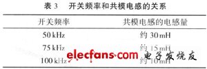 當(dāng)開關(guān)電源頻率增加時,所需的共模電感可大大減小,共模電感體積也減小。但是,開關(guān)電源在20MHz以上頻帶的輻射噪聲份量有所增加,給輻射騷擾的達(dá)標(biāo)帶來麻煩。開關(guān)頻率和共模電感的關(guān)系如表3所列。