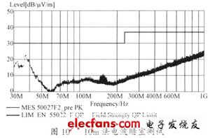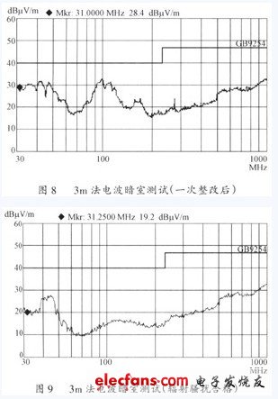 圖4、圖8、圖9是由3m法電波暗室測得,其輻射騷擾限值為30~230MHz準峰值限值40dB,230~1000MHz準峰值限值47dB。圖10是由10m法電波暗室測得,圖9與圖lO比較,輻射噪聲波形相差不多。僅在兒個頻率點的噪聲電平略有增加。