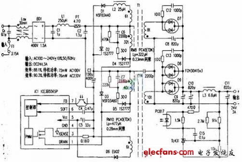 轉(zhuǎn)換IC選用了英飛凌公司第三代高整合功率集成電路——COOLSETF3系列產(chǎn)品ICE385565P,它在單一封裝中,結(jié)合了英飛凌COOLMOS功率金屬氧化層半導(dǎo)體場(chǎng)效應(yīng)晶體管(MOSFET),與新型的脈寬調(diào)制(PWM)控制集成電路。待機(jī)耗電量較其他同類產(chǎn)品少l,3,適用于設(shè)計(jì)更具成本效益、效率更佳的供電系統(tǒng)。