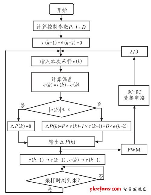 程序流程圖如圖6所示。通過A/D檢測得到實際輸出電壓c(k),將設(shè)定電壓r(k)與實測電壓c(k)比較,得本次偏差值e(k)。當(dāng)|e(k)|≤ε(ε為死區(qū)偏差)時,不進(jìn)行調(diào)節(jié);當(dāng)e(k)不在死區(qū)范圍時即進(jìn)行PID調(diào)節(jié),計算公式如式(3)所示。