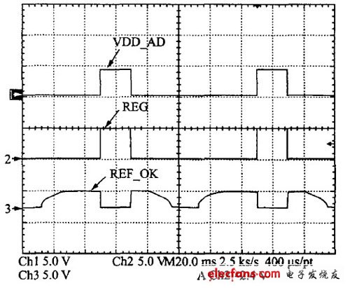 VDD-AD是檢測(cè)模塊的供電電壓,設(shè)計(jì)驅(qū)動(dòng)能力為2 mA.芯片負(fù)載減小時(shí),關(guān)斷REG,減小了芯片的靜態(tài)功耗,這樣既能保證芯片的驅(qū)動(dòng)能力,又同時(shí)降低了芯片的靜態(tài)功耗。
