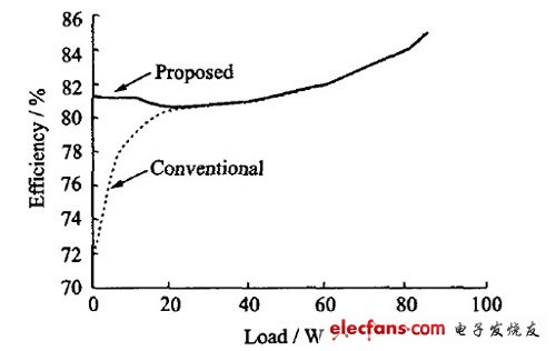 圖14給出了集成了該低功耗電源系統(tǒng)的綠色多模式反激式控制器的效率圖(工作頻率為40~130kHz),并與傳統(tǒng)的反激變換器效率進(jìn)行了比較。由圖可知,采用多模式反激式控制降低了芯片的輕載功耗,提高了效率。