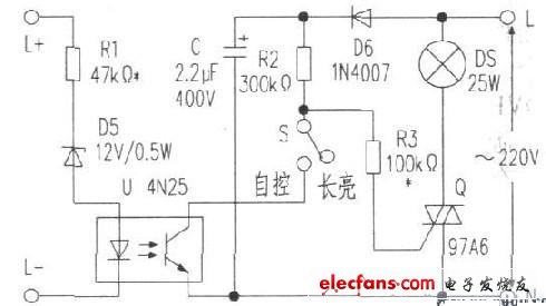 在上圖中,電阻Rl、穩(wěn)壓二極管D5和光電耦合器U中的發(fā)光二極管組成電壓檢測電路。二極管D6半波整流,電容C濾波:電阻R2、電阻R3、開關(guān)S和雙向可控硅O及光電耦合器中的三極管組成交流開關(guān)控制電路。