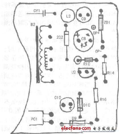 實(shí)際上,只更換開(kāi)關(guān)電源的一個(gè)電阻,就把輸出為5.3V的開(kāi)關(guān)電源變成了電磁爐低壓電源(舊開(kāi)關(guān)電源次級(jí)電路見(jiàn)上圖.元器件改造示意圖見(jiàn)下圖)。具體的做法是:撬開(kāi)外殼,取出電路板,拆掉電源次級(jí)ZD1、ZD2兩只穩(wěn)壓管和C8、C9兩只耐壓低的電解電容(可在C8位置安裝耐壓25V以上的濾波電容,也可不安)。關(guān)鍵是改變R14的阻值。例如,若把R14換成31kΩ就可得到12V;換成45kΩ就可得到16V;換成52kΩ,就可得到18V等。如果更換電阻后,輸出電壓略低于額定值,只要用刀片在電阻上刮刮,就可增大電阻值,使其達(dá)到額定用電壓值(作為應(yīng)惠修理是可以的——編者),就可以不用男換電阻了。