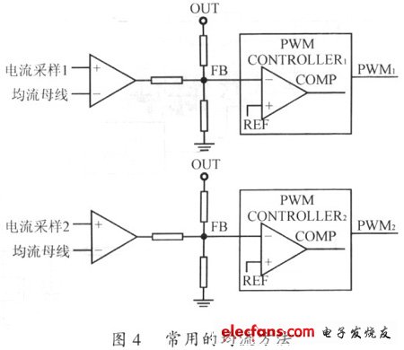 圖4為常見均流方法的原理圖。如果均流母線是并聯(lián)模塊電流的平均值,則是平均值均流法;如果是并聯(lián)模塊電流的最大值,則是最大值均流法;如果均流母線是并聯(lián)模塊中的主模塊的電流,則就是主從均流法。但是,在這些均流方法中,每個(gè)模塊都需要有一套獨(dú)立的PWM控制環(huán)。